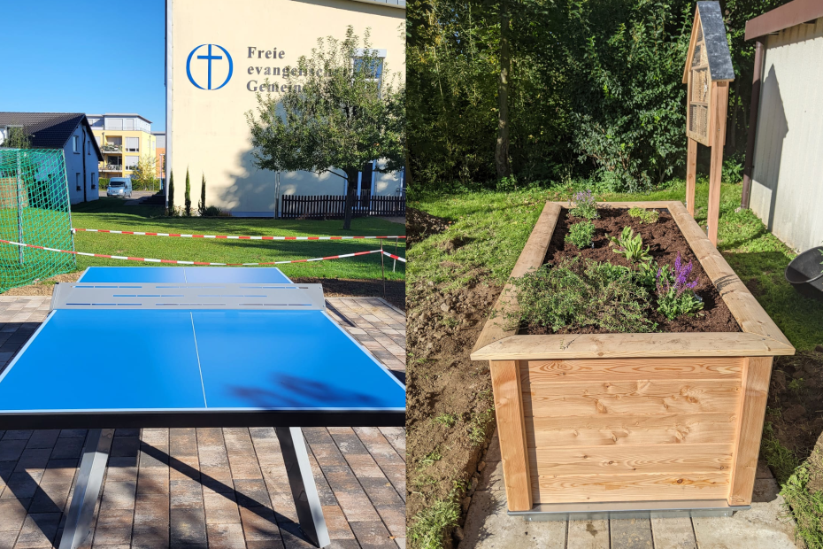 Im öffentlich zugänglichen Gartenbereich der Freien Evangelischen Gemeinde (FeG) in Rheinbach wurde ein Insektenhotel, ein Hochbeet sowie eine Tischtennisplatte aufgestellt, um neue Aktivitätsmöglichkeiten für alle zu schaffen und einen Beitrag zum Natur- und Artenschutz zu leisten.